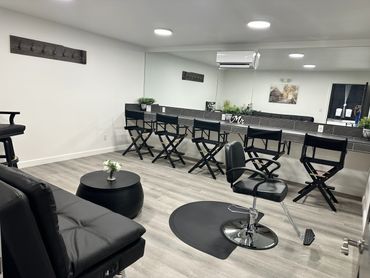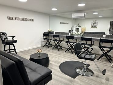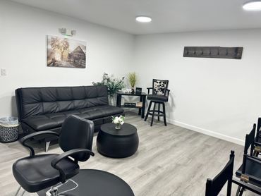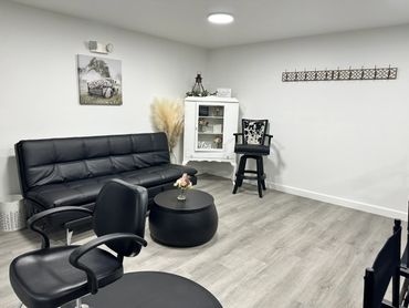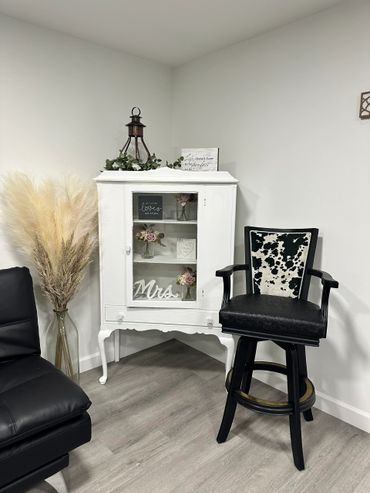 Our bridal suite is a 16x16 room, heat and air, barber chair for the ladies to get all beautiful for their big day as well as 5 studio chairs along our tile counter (extra chairs if needed), sofa along with a cow print chair